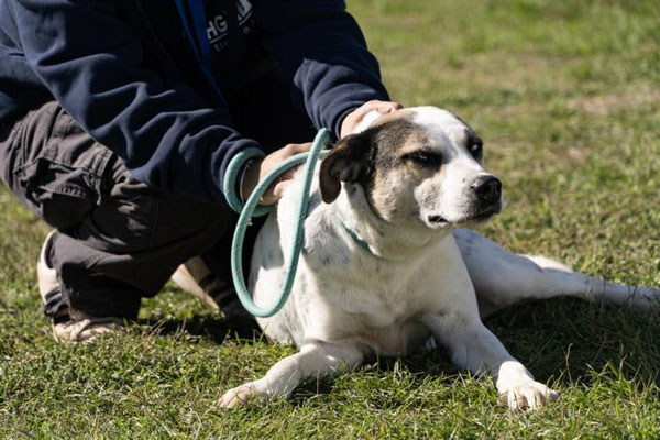 Er legt sich gerne auf den Rücken und genießt es, am Bauch gekrault zu werden. An der Leine läuft er gut – ab und zu zieht er etwas, was völlig normal ist, da er nur einmal im Monat für etwa 30 Minuten spazieren geht.