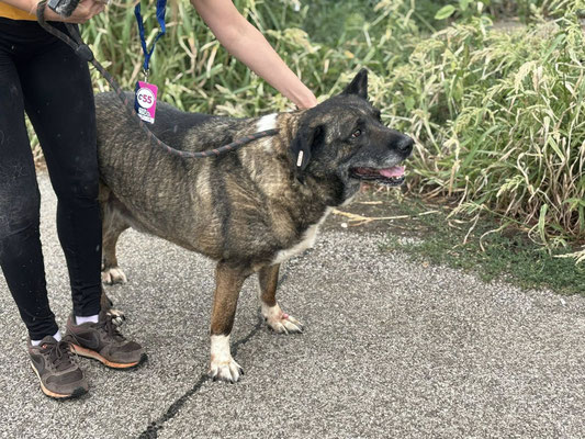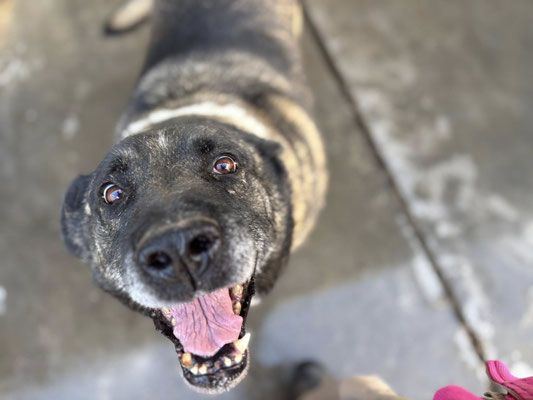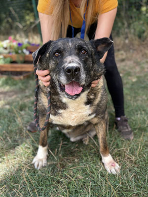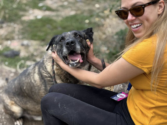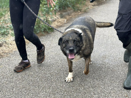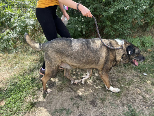Außerdem zeigt er uns auch, wie gerne er massiert, gekuschelt und gestreichelt werden will. Wenn wir uns bei der Hitze eine Pause gönnen und in den Schatten setzen, fordert er seine Streicheleinheiten regelrecht ein. Er läuft entspannt an der Leine, und natürlich könnte er auch ein paar Kilo abnehmen, damit er wieder etwas fitter wird.