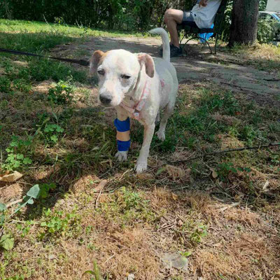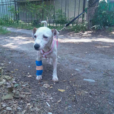 Räude ist vollständig abgeheilt. Ihre Haut ist von Zeit zu Zeit leicht gerötet. Laut den Ärzten liegt das daran, dass sie weiß ist und die Haut etwas empfindlich auf Gräser