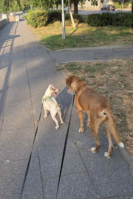 versteht sich gut mit den Hunden auf ihrer Pflegestelle, sie mögen sich, spielen gerne miteinander, fressen zusammen und es gab noch nie irgendwelche Konflikte.