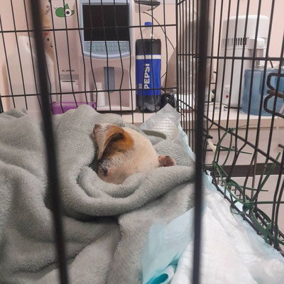 oder ein Kaninchen war. Es lag am Straßenrand und versteckte sich in den Büschen. Es stellte sich heraus, dass es ein Hund war. Ein Miniaturhund. Verschmutzt, schwach, schorfig,