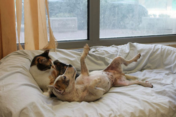 Auch mit den Katzen kommt sie gut klar, diese sind jedoch an Hunde gewöhnt und verhalten sich entsprechend. Wenn sie draußen auf Katzen trifft, hat sie ein großes Verlangen, sie