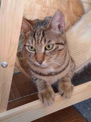 Macy ist eine kleine getigerte Katze mit großen, neugierigen grünen Augen. Sie jagt Mäusespielzeug mit großer Beharrlichkeit. Wenn kein Spielzeug in der Nähe ist, reicht ihr ein zerknüllter Papierball zum Spielen. Der Flur ist eine Rennstrecke. Das Sofa ist ein Berg, den sie mit einem einzigen Sprung erklimmt.