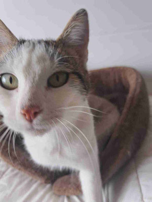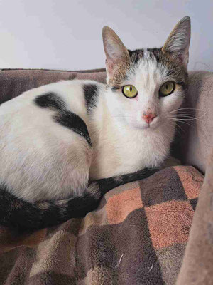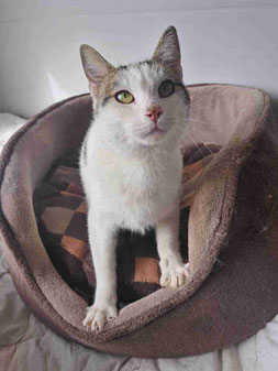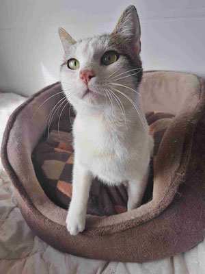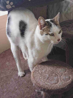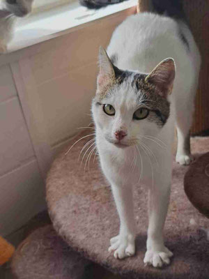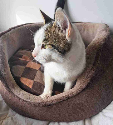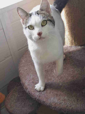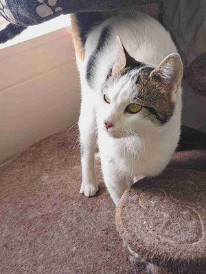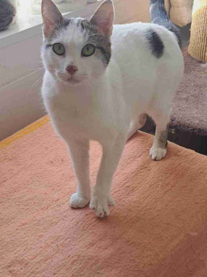 Er tauchte vor meinem Haus auf, wo wir ein paar Katzen füttern, als er etwa 2 Monate alt war. Eine Woche lang war er sehr schüchtern, versteckte sich unter dem Auto und ließ sich nicht anfassen. Aber mit jedem Tag wurde es besser und er kam heraus. Nach ein paar Wochen schloss er großes Vertrauen zu mir, sodass ich ihn bei mir aufnahm. Zuerst lebte er bei uns zu Hause, damit ich mehr Zeit mit ihm verbringen konnte. Dann kam er ins Tierheim und freundete sich mit Izzy, Puhi und Willi an.