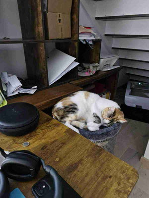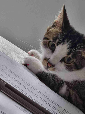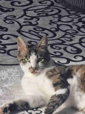 Aya, die kleine Jägerin, ist besonders geschickt und liebt es, zu beobachten. Ihre Lieblingsbeschäftigung: Stundenlang vor dem Schlangenterrarium sitzen und die Strumpfbandnatter beobachten – ganz die konzentrierte Katzenjägerin. Streicheln mag sie nicht besonders, aber sie wirft sich gerne demonstrativ auf den Boden oder schmiegt sich genüsslich an Möbelstücke.