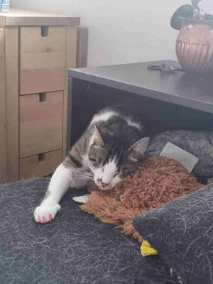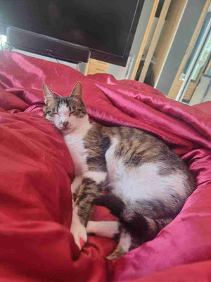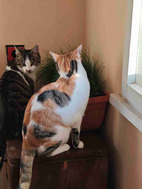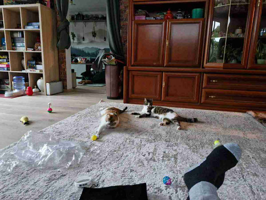 Aya und Smith leben seit etwa drei Monaten in ihrem derzeitigen Zuhause. Anfangs waren sie sehr ängstlich und versteckten sich tagelang hinter Möbeln. Doch mit Geduld und Ruhe tauten sie langsam auf und begannen, Vertrauen zu fassen. Inzwischen suchen sie aktiv unsere Nähe, schlafen offen sichtbar und zeigen ihre einzigartigen Persönlichkeiten.