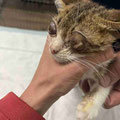 Das arme Baby erschien im Garten einer Freundin, und sie rief mich sofort um Hilfe, da sie keine Erfahrung mit Katzen hat. Der Tierarzt in der nächsten Stadt bot sofort Euthanasie an!